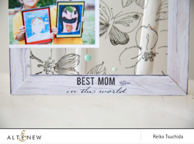 スタンプは表から押して、失敗してもふき取って再度スタンプし直せるのがクリアシートの利点です。スタンプしたイメージが乾いたら、木目柄のペーパーからカットした4本の紙をフレームに見立ててクリアシートに貼っています。