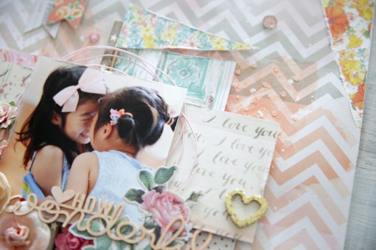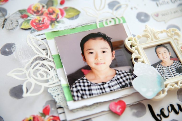 ここでは、American CraftsとHeidi Swappのコレクションから、花・文字・水玉・ハートなどのハギレペーパーをランダムに重ねあわせて、写真の下に敷く「マット」として活用しました。