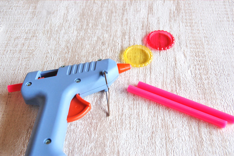 使用するのは、当店でも販売しているプラボトルキャップ、グルーガン、グル―スティック、それからスパンコール、ビーズ、文字パーツなどの装飾パーツです。