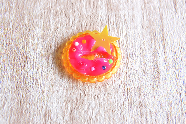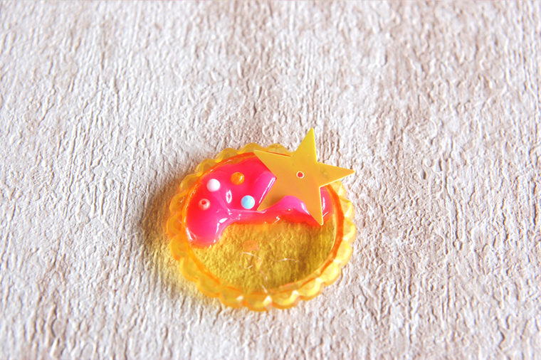 こちらは透明粘土で自作した星パーツと、はさみでカットした紙パーツを埋め込んで、アクリル樹脂系のニスを塗ったもの。