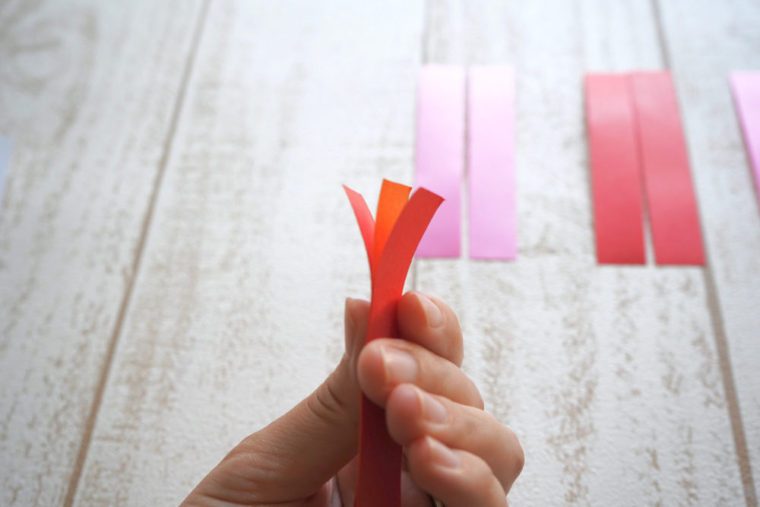 下図のように短い紙テープをハートの形に整え端を合わせます。