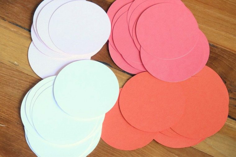1.3~4種類のカラーペーパーを丸く切り抜きます。サークルカッターや抜型を使ってたくさん作っておきましょう。サイズは大きいサイズと小さいサイズの2種類用意します。サークルカッターや抜型がなくても、フリーハンドで少しいびつな丸にしてもかわいいですよ♪色はグラデーションになるように、同色系でまとめるのがポイント。今回は、クリスマスパーティ用に赤のグラデーションと白系をチョイス。