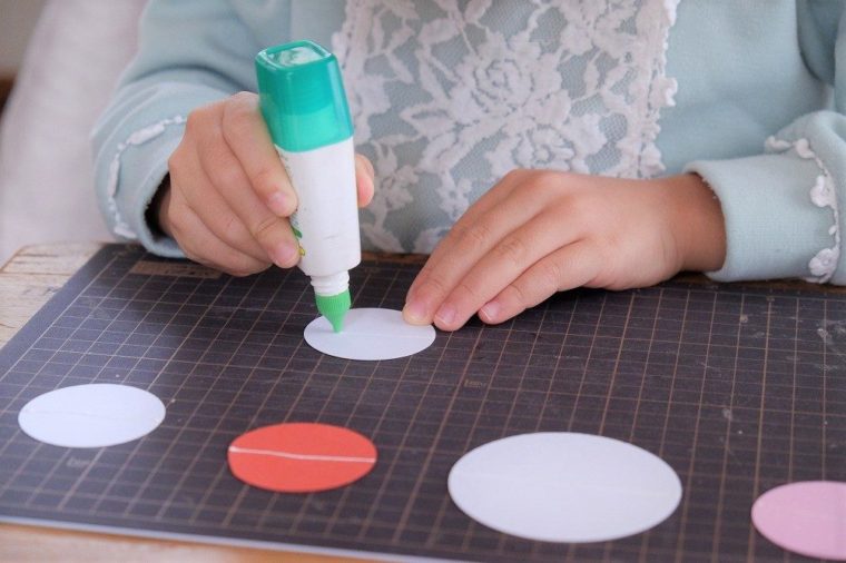 2.色とサイズをまんべんなくバラバラになるように並べたら端からボンドを一直線に細く塗っていきます。