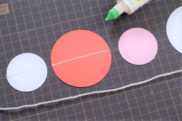 3.ボンドが6割くらい乾いてきたら(半乾きの状態)毛糸をのせて上から押すように貼り付けます。少し乾かした状態で貼り付けるとボンドがずれることなくしっかり貼りついてくれます。丸と丸の間は3cmほど開けて等間隔で貼っていきます。