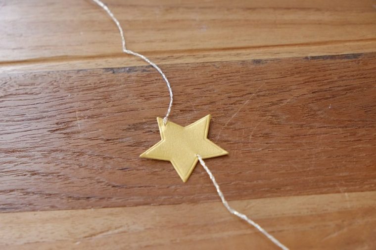 6~8個ほど星形ペーパーを通したら糸の終わりを玉結びします。