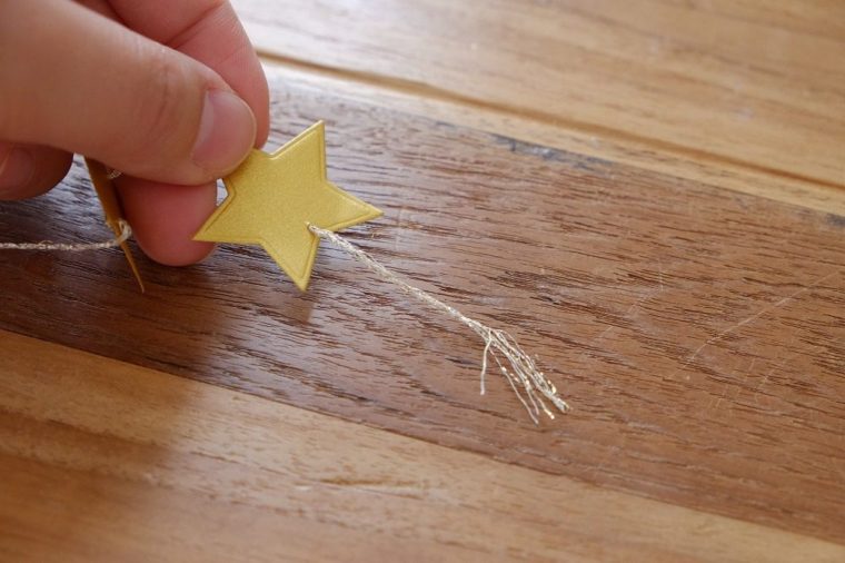 星のてっぺんに表から裏に、下部に裏から表に糸を通します。