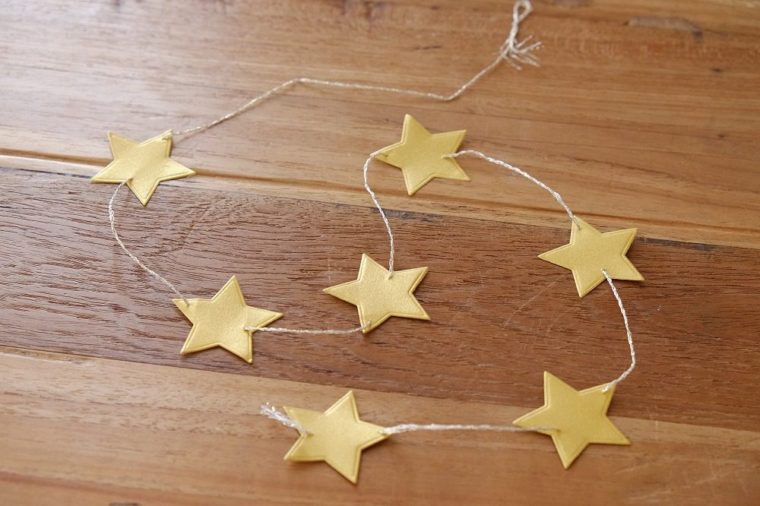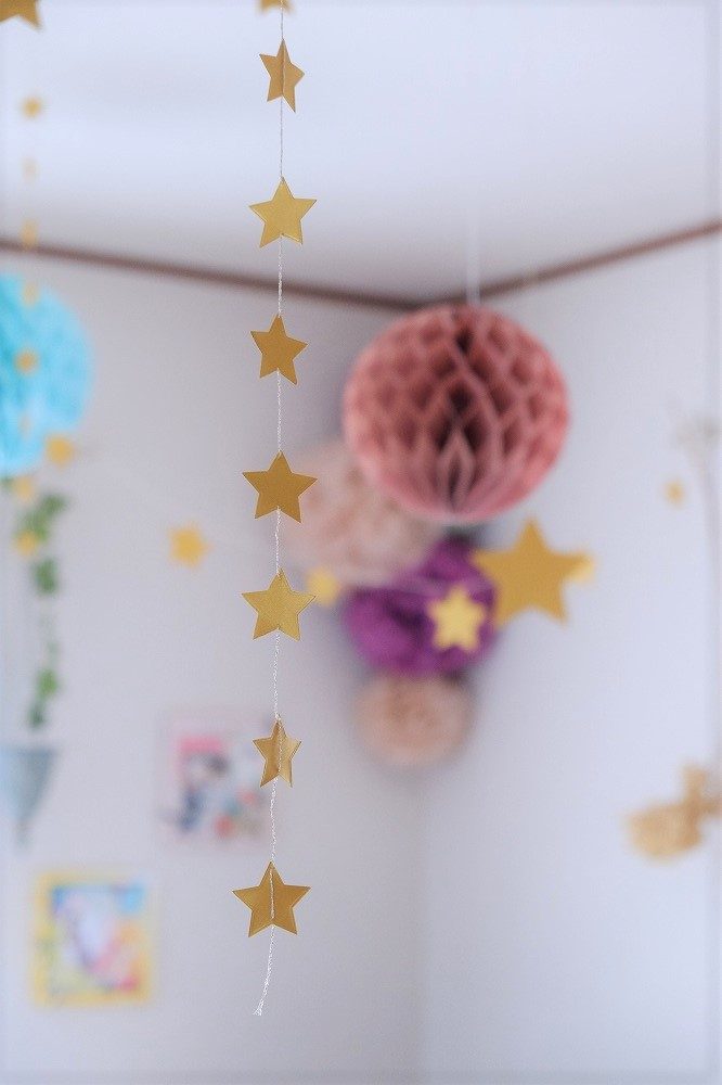 天井から吊るしたり、カーテンレールに吊るしたり、どこに飾ってもキュートなスターガーランドの完成です。