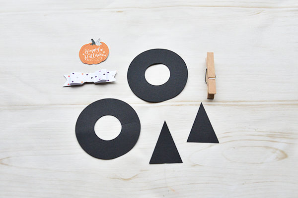 黒などのペーパー、木製ピンチ、リボンやハロウィンのシールなどの飾り