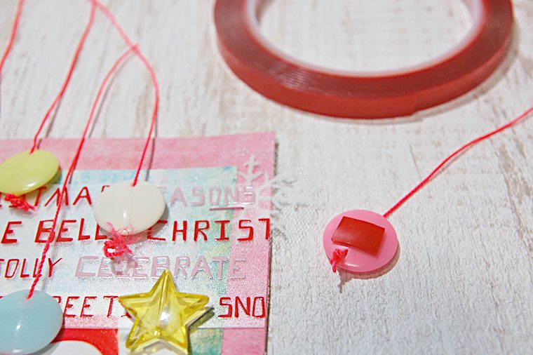 タブレット型のビーズに細いヒモを通し、オーナメントがぶら下がっているように貼ってみました。