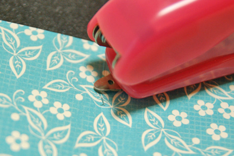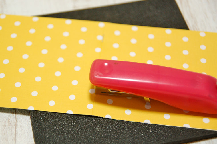 折り線の部分を2枚重ねて、折り山が上にくるように固いスポンジや段ボール等の上に置き、開いたステープラーの上部を折り線部分に押しつけるようにして針を打ちます。